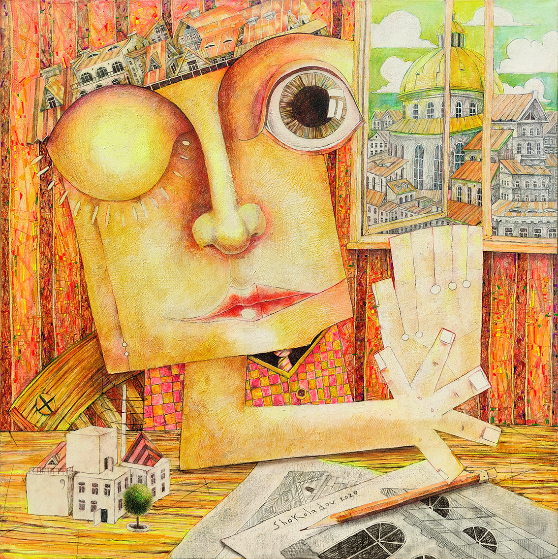 The painting symbolizes the world, reflecting the stages of the architect's idea as it moves from conception to its real-life embodiment.
